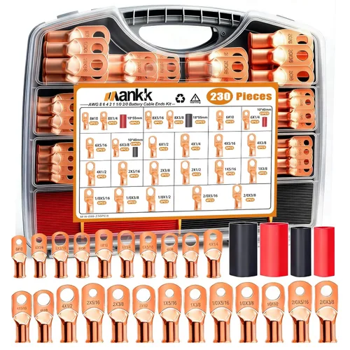 【Materiales de calidad】El conector de terminal de batería está hecho de material de cobre puro de alta calidad. Esto los hizo tener una gran resistencia a la corrosión y a la oxidación. Los conectores terminales de alambre están hechos con cobre estañado y aislante de PVC. Este material tiene una conductividad eléctrica extremadamente fuerte, que puede maximizar la corriente. El tubo termorretráctil está hecho de poliolefina, que puede ser retardante de llama y aislado. Aplicación: estas lengüetas de batería son adecuadas para electricistas, y se pueden utilizar en muebles, armarios de distribución de energía, automóviles, barcos, motocicletas, electrodomésticos, cables de bricolaje, etc. Los terminales de anillo aislados pueden ayudarlo a ordenar los cables dispersos y evitar que se desgasten o se rompan. Los extremos del cable de la batería se utilizan para una instalación estable, evitando cortocircuitos y estableciendo una conexión confiable y segura. 【Diseño】El conector de terminal de anillo está diseñado con un orificio en forma de cuerno, lo cual es conveniente para la inserción de alambre. El diseño de la abertura es conveniente para verificar si el cable está insertado correctamente y completamente. Nuestras terminales están impresas con el tamaño del modelo, por lo que puedes encontrar la terminal correcta rápidamente. El tubo termorretráctil tiene dos colores, negro y rojo, lo cual facilita la identificación y organización de la conexión entre los electrodos positivos y negativos. 【Cómo usar】Para obtener el mejor efecto de uso, se puede utilizar junto con el tubo de compresión adjunto para extracción de energía o conexión a tierra, lo que reduce la aparición de posibles peligros de seguridad. Cuando el cable se prensa o se solda, se puede encoger rápidamente para envolver el cable insertando un tubo termorretráctil y calentándolo con una herramienta termorretráctil. 【El paquete incluye】AWG1, AWG2, AWG4, AWG6, AWG8, AWG1/0, AWG2/0, 1/4", 5/16", 3/8" y 1/2" de diámetros de orificio de perno y tubo termorretráctil 3:1; Un total de 230 piezas de surtido de terminales de alambre de cobre. Suficiente reemplazo para satisfacer tus necesidades. Se colocan en una caja de herramientas multiusos y portátil con un divisor móvil para una fácil distinción. Después de su uso, otros productos se pueden almacenar y reutilizar.