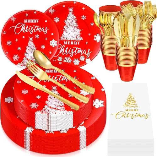 El paquete incluye: 175 piezas de vajilla de plástico navideña, incluyendo 25 platos llanos, 25 platos de postre, 25 servilletas, 25 tenedores, 25 cuchillos, 25 cucharas y 25 tazas de 9 onzas; ya sea que estés mirando estos platos rojos de Navidad para una reunión familiar, fiesta de oficina o cena de Navidad, este juego sirve para todas tus necesidades de fiesta, dejando una Navidad memorable. Experiencia para todos tus invitados Diseño temático de Navidad: cada plato de cena y postre de Navidad cuenta con un color rojo festivo que mejora el ambiente navideño en cualquier entorno; las servilletas de feliz Navidad están adornadas con encantadores estampados de árbol de Navidad que dejarán a tus invitados asombrados; establece el ambiente festivo con estos platos y servilletas de árbol de Navidad Platos de Navidad duraderos: nuestros platos rojos de Navidad están hechos de plástico, resistente y duradero, por lo que no tienes que preocuparte por los vidrios rotos durante tus festividades navideñas; los platos llanos de 10.25 pulgadas y los platos de postre de 7.5 pulgadas vienen con un buen tamaño para sostener el pavo y el relleno que puedes servir, lo que te permite disfrutar cómodamente de tu comida navideña sin preocuparte de derrames Joyful Christmas Servillet: ningún juego de mesa de fiesta de Navidad está completo sin servilletas de papel de Navidad; estas servilletas, plegadas a 8.5 x 4 pulgadas pero que se despliegan a 11.8 x 17 pulgadas, proporcionan a tus invitados una gran superficie para limpiar sus manos o limpiar un derrame, adecuado para mantener a tus invitados limpios y ordenados mientras disfrutan de su comida Práctico y reutilizable: nuestros platos de plástico navideños pueden mantener tus mesas limpias y ahorrarte la molestia de lavar platos, reducir el tiempo de limpieza, por lo que puedes tener más tiempo para hablar con los invitados y disfrutar de la fiesta de Navidad juntos, y también puedes usarlos varias veces antes de reemplazarlos y reciclarlos