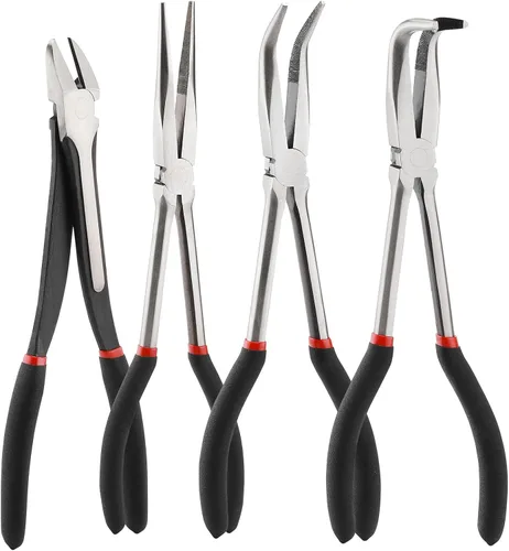 El juego incluye: 1 alicates de punta recta, 1 alicates de nariz doblada de 45°, 1 alicates de nariz doblada de 90°, 1 alicate diagonal. Material de alta calidad: el juego de alicates está hecho de acero al carbono forjado de alta calidad con pulido para un sólido, duradero y antioxidante. Alcance extra largo: la longitud extra larga de 11 pulgadas permite el acceso a áreas de espacio limitado/espacios estrechos y mantiene tus manos alejadas de bordes afilados para trabajar sin esfuerzo alrededor de obstrucciones, agarrar piezas pequeñas, doblar y cortar alambre de metal. Agarre cómodo: el mango grueso es más cómodo, y el efecto antideslizante y resistente al aceite es mejor. Múltiples usos: tira de alambre y otros materiales finos (alicates rectos de 11 pulgadas de largo alcance); agarre y redondeo en el exterior para enlazar y doblar (alicates de nariz doblada de 11 pulgadas, 45° y 90°, recortar alambre y bridas de cremallera, cortar a través de tornillos y clavos finos, y cubiertas de alambre de pelar y pelar (alicates de corte diagonal de 11 pulgadas de largo).