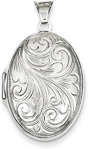 La cadena no está incluida. El medallón tiene capacidad para 2 fotos. Más de 3/4 pulgadas x 1 pulgada. Este medallón ovalado es de plata de ley 925 maciza y tiene capacidad para 2 fotos. La parte delantera y trasera de este medallón está bellamente grabada con un hermoso diseño. La parte delantera y trasera no se pueden grabar, sin embargo, el interior de este impresionante medallón se puede grabar con un mensaje personal. Este es el regalo perfecto para cualquier ocasión.