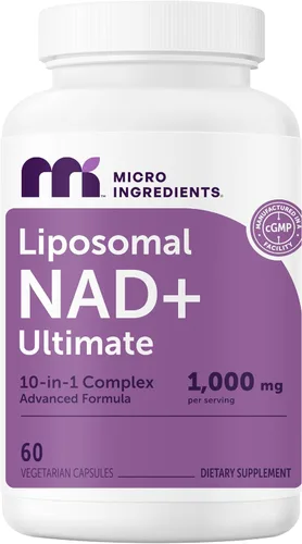 Micro Ingredients ofrece una fórmula liposomal NAD+ definitiva de 10 en 1 en cápsulas vegetarianas, combinando NAD+ con coenzimas, extractos de plantas como semillas de uva y carotenoides como la astaxantina en una porción combinada de 1.000 mg al día. 60 cápsulas vegetarianas naturales, que contienen 250 mg de NAD+ liposomal (proporcionando 100 mg de NAD+) mejorado con 200 mg de extracto de semilla de uva, 200 mg de extracto de té verde, 200 mg de raíz de cúrcuma, 50 mg de resveratrol, 50 mg de glutatión reducido, 25 mg de ácido alfa lipoico (ALA), 10 mg de quercetina, 10 mg de pterostilbeno y 5 mg de astaxantina. El NAD liposomal combina esta coenzima con fosfatidilcolina de lecitina de girasol en una forma de cápsula especializada que incorpora NAD+ en una mezcla basada en fosfolípidos para un uso diario simple. Cuenta con una combinación sinérgica de coenzimas, extractos botánicos y carotenoides cuidadosamente elegidos para complementar la vía NMN y las rutinas de bienestar diarias. Suplemento NAD premium sin OMG. Fabricado en una instalación conforme a cGMP sin soja, lácteos, gluten, trigo y nueces. Esta declaración no ha sido evaluada por la FDA. Este producto no está destinado a diagnosticar, tratar, curar o prevenir ninguna enfermedad.