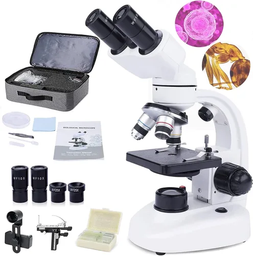 【MICROSCOPIO BINOCULAR DE ALTA POTENCIA】: El microscopio binocular está equipado con 3 lentes de objetivo (4X, 10X, 60X) y 4 oculares (2 cada uno para WF10X y WF35X gran angular). Trabajar con un ojo durante mucho tiempo te cansará. Sistema de iluminación LED doble ajustable: el microscopio está equipado con luces LED superiores e inferiores. Nuestra opción de iluminación LED superior se puede utilizar para ver objetos opacos como tela o algunas hojas, flores, etc. La luz LED inferior se puede utilizar para observar muestras transparentes o translúcidas y es fácil de operar. Diseño ergonómico: microscopio compuesto, tubo ocular de 45° que hace que la postura de visualización sea más cómoda y evita la fatiga de ojos y cuello. Al mismo tiempo, la base del barril de la lente se puede girar 360°, lo que permite ver en cualquier ángulo. La distancia interpupilar se puede ajustar de forma flexible entre 2.165-2.953 in según las necesidades del usuario para lograr el efecto de observación más ideal. Compartir en tiempo real: Microscopio para adultos, que proporciona un adaptador de teléfono móvil, lo que te permite capturar y grabar el hermoso paisaje que te rodea con tu teléfono inteligente. Puede compartir fotos o videos con su familia y amigos en tiempo real, y explorar las maravillas del mundo microscópico juntos. 【Fuente de alimentación dual】: microscopio estéreo, cable de alimentación y fuente de alimentación dual de batería, puedes utilizar este microscopio ya sea que lo desenchufes o no; también puedes usarlo al aire libre fácilmente.