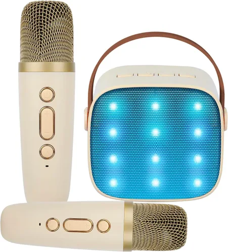 Mini máquina de karaoke con 2 micrófonos inalámbricos, altavoz portátil de karaoke Bluetooth para niños y adultos con luces LED, regalos para niñas