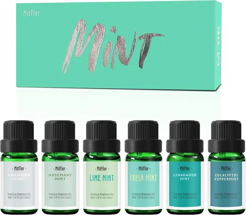 El juego de aceites aromáticos de menta MitFlor incluye una serie de aromas a menta; en cada aceite, la nota de menta refrescante combina bien con otros aromas, lo que te hace sumergirte en un fabuloso viaje de aroma a menta; los aceites incluyen menta de eucalipto, menta de romero, menta de cedro, menta de lima, menta de coco y menta fresca Premium y versátil: nuestros aceites perfumados de fragancia premium están altamente concentrados y cuidadosamente formulados para varios usos; funcionan bien para hacer velas perfumadas, perfumes, difusores de varillas y también son seguros para la piel y se pueden utilizar en productos de baño y cuerpo como jabón y loción Fiable y seguro: MitFlor siempre adopta un riguroso estándar de control de calidad; todos los aceites de aromaterapia se fabrican para cumplir con las pautas de IFRA y probados por expertos; son libres de crueldad, sin parabenos y sin alcohol, seguros tanto para ti como para el medio ambiente Aroma rico y refrescante: los aromas de estos aceites de fragancias para el hogar son extremadamente ricos, complejos y duraderos; además de ser aceites perfumados para muchos productos de bricolaje, también son adecuados como aceites difusores en difusor o humidificador para un día entero de relajación y frescura Lo que obtienes: aceites aromáticos de 6 x 0.3 onzas líquidas con una delicada caja; este juego de aceites esenciales de aromaterapia será un regalo ideal para tu pareja, familiares y amigos en Navidad, Día de San Valentín y otros festivales Nota: nuestros aceites aromáticos vienen en botellas verdes o marrones, se envían al azar