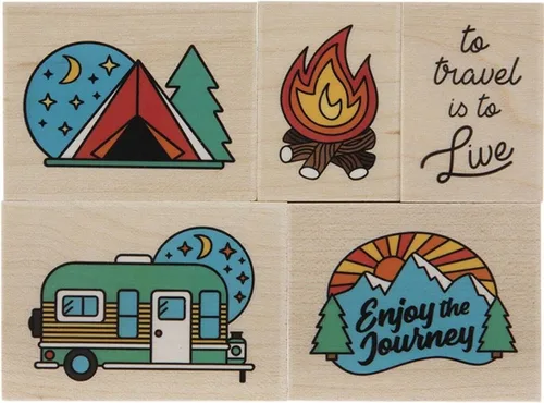 Momenta Enjoy the Journey - Juego de 6 sellos de madera de goma roja para acampar y viajar al aire libre Este juego de 6 sellos montados en madera de goma roja es el juego perfecto para todos tus álbumes de recortes, tarjetas y otros proyectos de manualidades.