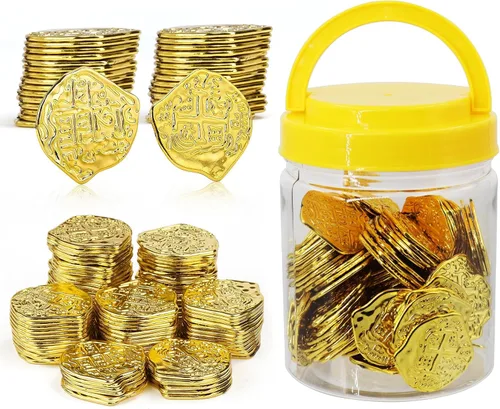 ¿Para qué sirve Monedas piratas de oro de plástico, 100 unidades, juego del tesoro pirata, réplica dorada, monedas de doblones españoles con frasco, juego?