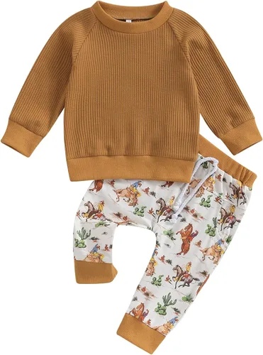 Muasaaluxi Ropa occidental para bebé niño, sudadera de manga larga con cuello redondo y estampado de vaca, pantalones de vaquero para otoño e