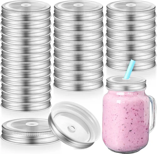 Mudder Paquete de 26 tapas para tarros de conservas Mason con agujero para popote para tarros de metal de boca ancha regular con agujero para