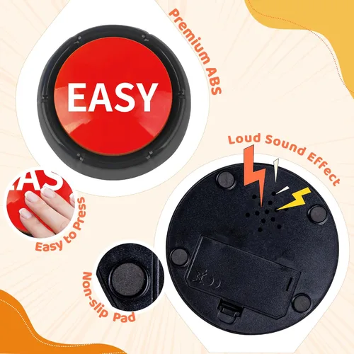 Botón zumbador con sonido: el botón fácil está hecho muy duradero, ligero y funciona con pilas. Pulsa el botón para reproducir '¡Eso es fácil!' 【Fácil de usar】No hay necesidad de configuraciones o ensamblajes complicados. Simplemente inserta la batería en el compartimento, enciende el interruptor y prepárate para presionar este botón novedoso en cualquier momento que te apetezca. Tamaño adecuado: el botón fácil es de aproximadamente 3.5 x 3.5 x 1.5 pulgadas (largo x ancho x alto) y solo 0.41 libras, tamaño adecuado para usar y llevar. Ambiente: ya sea que estés en una fiesta, un juego, un discurso o un partido de fútbol, puedes hacer un buen uso de nuestro botón para mejorar la atmósfera. Gran regalo de oficina: los juguetes de escritorio de oficina son regalos divertidos de oficina, divertidos regalos de broma y juguetes eficaces para aliviar el estrés. Compra esto como un regalo de broma para tu jefe o colega