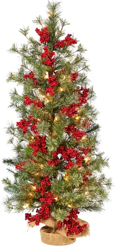 Alambre de hierro, arpillera, PVC ACENTO DE DECORACIÓN DE TEMPORADA: Las áreas estrechas también merecen algo de alegría navideña. Decora espacios delgados y pequeños como vestíbulos, esquinas y apartamentos con este árbol de Navidad artificial de pino verde y bayas. Llega pre-encordado con 50 luces cálidas que crean ese brillo navideño. De pie a 3 pies. desde una base de arpillera (incluida en altura), arregla incluso los espacios más estrechos Fabricado con materiales de calidad: Inspirado en la naturaleza y elaborado por horticultores, este producto está fabricado con materiales de alta calidad para garantizar la longevidad año tras año. Compra con confianza sabiendo que nuestros artículos "se ven tan reales, son casi naturales" Dimensiones y tamaño: Dimensiones del producto: 17 pulgadas. Ancho x 17 pulgadas. de profundidad x 36 pulgadas. Altura: Dimensiones de la base: 12 pulgadas. Largo x 12 pulgadas. Ancho x 3 pulgadas. H. Las medidas se calculan a partir de cada dimensión más extendida Fácil de mantener: 92 ramas y tallos flexibles son perfectos para adornos y permiten una fácil remodelación para alcanzar la plenitud y forma deseadas. No necesita riego ni recorte PRELITO: Preencordado con 50 luces incandescentes blancas cálidas (bombillas de repuesto incluidas); 60 pulgadas. Cordón incluido. Certificado UL