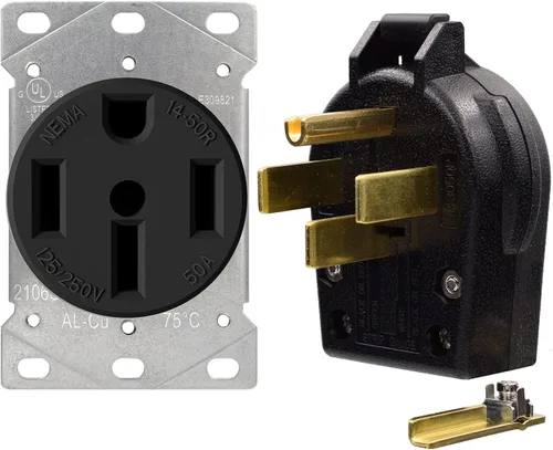 ⭐NEMA 14-50R - Receptáculo de salida de rango de montaje empotrado de 50 amperios, 125/250 voltios, autoconectado, 3 polos, 4 cables. ⭐NEMA 14-50P - Enchufe de ángulo recto de hoja recta de 50 amperios y 125/250 voltios, autoconectado, 3 polos, 4 cables. ⭐Resistente: construido con los estándares más exigentes de rendimiento y fiabilidad. Hecho de material de nailon resistente a la humedad, productos químicos y al abuso para soportar el mayor abuso, resistir impactos y grietas. La temperatura de funcionamiento es de -40℉ a 140℉. Máxima conductividad: los contratos de aleación de cobre de calibre pesado y doble limpieza permiten la máxima conductividad, ideal para usar en una variedad de aplicaciones eléctricas, especialmente enchufe de repuesto para secadoras, RV, rangos, soldadores, autos eléctricos, etc. Ideal para aplicaciones residenciales, comerciales, institucionales e industriales. Elección preferida de electricistas y contratistas. ⭐Fácil instalación: para garantizar un cableado correcto y rápido, los terminales tienen marcas de identificación. El montaje empotrado se adapta a una carcasa de dos elementos y tornillos de montaje incluidos. Completamente listo para cablear, acorta significativamente el tiempo de instalación. Los terminales aceptan #10, #8 a #4 AWG.