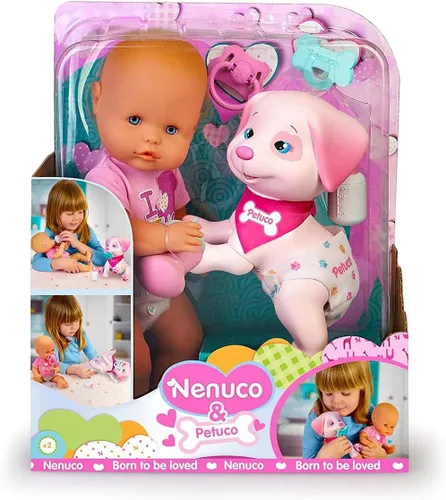Dale a tu pequeño dulces compañeros de juego, Nenuco y Petuco Duplica la diversión con el bebé y el cachorro con su chupete y accesorios de biberón. ¡Cuidado, este encantador dúo tanto orina! Nenuco es de 16 pulgadas, el tamaño perfecto para que los niños jueguen y lo lleven. Incluye una muñeca de bebé, traje "I heart Petuco", chupete para bebé, biberón, pañal para bebé, un cachorro, chupete para cachorro, biberón y pañal para cachorro.