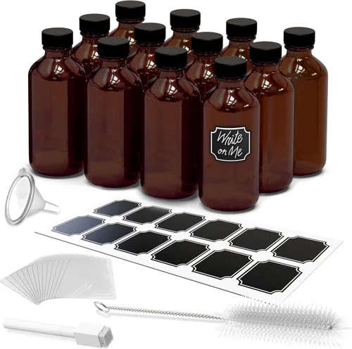 | Elementos incluidos | 1 cepillo para botellas de 6.5 pulgadas, 1 embudo de plástico transparente, 12 botellas de vidrio de 8 onzas con tapas, 12 calcomanías de etiquetas y 1 marcador borrable, 15 piezas de envoltura retráctil |