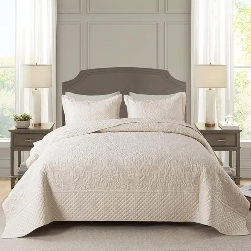 Frente: 100% microfibra Estilo único: patrón floral jacquard en relieve color beige Juego de edredón tamaño Queen: 1 edredón (90 x 98 pulgadas) + 2 fundas de almohada (20 x 27 pulgadas) Instrucciones de cuidado: lavar a máquina por separado en agua fría. Secar en secadora a baja temperatura, planchar tibio si es necesario. Artesanía experta: La costura doble de caja cerrada especializada de la funda de cama acolchada mantiene tu relleno uniforme, incluso después del lavado. Juego de edredón duradero: un hermoso patrón floral en toda la colcha y acentuado en los lados de la colcha con bordes festoneados para suavizar la colcha.