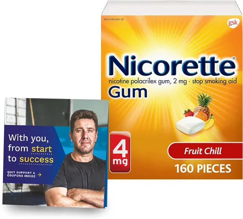 Un paquete de 160 piezas de goma de mascar de nicotina Nicorette de 4 mg con sabor a Fruit Chill para ayudar a dejar de fumar con el programa de apoyo conductual - Ayuda para dejar de fumar Esta goma de mascar Nicorette te ayuda a controlar la ingesta de nicotina y calmar los antojos de cigarrillos Las ayudas para dejar de fumar reducen los antojos y los síntomas de abstinencia asociados con dejar de fumar como parte de la terapia de reemplazo de nicotina de venta libre Goma de mascar para dejar de fumar hecha con una tecnología de doble capa que libera una explosión de refrescante sabor Fruit Chill Productos para dejar de fumar para aquellos que fuman su primer cigarrillo dentro de los 30 minutos de despertarse