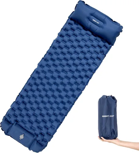 【Fácil y rápido】Infla la almohadilla de dormir Night Cat fácilmente pisando la bomba de pie, solo toma 30 segundos para esta almohadilla de dormir individual, no es necesario soplar laboriosamente con la boca o traer una bomba adicional. También se desinfla súper rápido, abre la válvula de desinflado y el aire se libera inmediatamente. Perfecto para camping, senderismo, escalada, mochileros o picnic, buena opción para dormir en el coche. 【Cómodo y duradero】Tamaño inflado: 195 x 65 cm (77" x 25.5"), con almohada incorporada. Cientos de celdas de aire en forma de panal pueden distribuir el peso de tu cuerpo para proporcionar un mejor soporte, sin límite para cualquier posición de sueño. La tela de nailon recubierta de TPU hace que la alfombrilla para dormir sea más silenciosa pero más duradera, y también amortigua el aire caliente o frío del suelo. Diseño extensible: la colchoneta para dormir está diseñada con cierres a presión en ambos lados. Conecta dos o más colchonetas individuales por los cierres a presión en los lados para ser una almohadilla de tamaño más grande para compartir horas felices con tu pareja, amigo o familia. 【Ultraligera y Compacta】Con una bolsa de transporte portátil, tamaño empaquetado 14x27cm (5.5"x10.5"), solo pesa 800g (1.8lb), esta ligera almohadilla de aire para acampar se puede guardar fácilmente en tu mochila, bicicleta o automóvil, y llevar a cualquier lugar como jardín, parque, montaña, playa para actividades al aire libre. Combina perfectamente con tienda de campaña o hamaca. 【Parche de reparación】También preparamos el parche de reparación para ti en caso de cualquier desgarro que pueda causar fugas de aire.