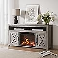 BELLEZE Soporte de TV con chimenea eléctrica de madera con puerta de granero para televisores de hasta 65 pulgadas, estantes y armarios abiertos,