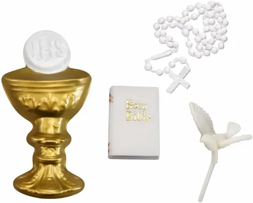 Este kit de pastel de la primera comunión es perfecto para la primera comunión de cualquier persona. Este kit viene con una tapa para pastel de Host y Cáliz y un hermoso rosario. También incluye una paloma y una Biblia sagrada.