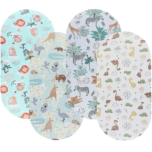 Juego de 4 sábanas para moisés. Nuestras sábanas bajeras para moisés vienen en 4 estampados diferentes. la jirafa de mono león impresa y la rama verde, el rinoceronte jirafa cebra impreso y rama verde, el otro impreso koala avestruz y canguro, y el último dinosaurio impreso. Todas las impresiones son perfectas para el bebé. Hechas de tela de punto de alta calidad, nuestras sábanas para moisés son suaves, transpirables e hipoalergénicas, suaves para la delicada piel del bebé. Proporcionará un ambiente de sueño súper cómodo para tu pequeño. Con un tamaño de 32 x 16 x 4 pulgadas, nuestras sábanas para bebé son universales para la mayoría de los colchones de moisés rectangulares ovalados de reloj de arena. La banda elástica está cosida a lo largo de la sábana para cubrir el colchón del moisés de forma cómoda y firme, por lo que nuestra sábana bajera no se mueve fácilmente cuando el bebé duerme o juega. Cuidado fácil: nuestro juego de 4 sábanas para moisés es fácil de limpiar, lavar a mano y a máquina.