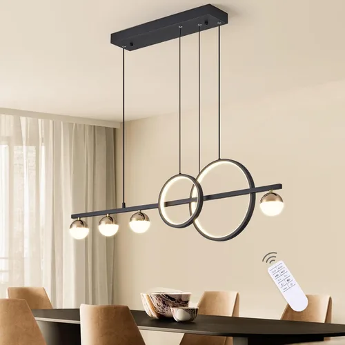 ✅【3 colores de intensidad regulable con control remoto + alto rendimiento】- Temperatura de color: 3000-6000K. Brillo: 10-100%. La lámpara de araña en negro y dorado puede brindarte una atmósfera de Luz Blanca, Luz Neutra y Luz Cálida para disfrutar. Diseñado con sistema de protección ocular, la lámpara de araña LED moderna ilumina uniformemente, sin luces deslumbrantes. CRI>80. ✅【Suministro directo de fábrica + Rentable】- Aluminio de aleación de alta calidad seleccionado, proceso de pintura en aerosol para hacer que la lámpara de cocina sea resistente a la corrosión y no se desgaste fácilmente. Y las bombillas acrílicas y la silicona hacen que la luz sea más suave, más cercana a la luz natural. Esta iluminación colgante negra y dorada para isla de cocina tiene una mayor eficiencia luminosa. 【4 bombillas incluidas】 ✅【Diseño distintivo + Tamaño adecuado】- Longitud: 39 pulgadas/100 cm. Tamaño del chasis: 19.7 * 4.7 * 1.6 pulgadas (50 * 12 * 4 cm). Cable colgante ajustable: 150 cm. El candelabro LED lineal es ampliamente utilizado en comedor, sobre mesa de comedor, isla de cocina, oficina, restaurante, bar, sala de estar, dormitorio, etc. Lineal con 2 anillos y 4 globos. El diseño único de la lámpara colgante LED moderna puede combinar con varios estilos de decoración del hogar. ✅【Eficiencia energética + larga vida útil】- Potencia: 45 W. Flujo luminoso: 3000 lm. Voltaje: 110V (adecuado para sistemas de voltaje locales). La unidad de alta calidad garantiza que la iluminación colgante de cocina sobre la isla sea segura y estable. Los chips LED de la iluminación de la lámpara colgante de tipo candelabro se actualizan de manera iterativa, vida útil promedio >40,000 horas. ✅【Fácil de instalar + servicio postventa satisfactorio】- Sin complicaciones de montaje, solo tienes que abrir el paquete e instalar directamente las modernas lámparas de comedor sobre la mesa en el techo. Cualquier pregunta sobre los modernos candelabros LED para comedor, contáctenos a través de Yaxa Massage Box. Nuestros ingenieros responderán dentro de 6 horas. ►Recordatorio: no es compatible con interruptor de pared de atenuación ¡Por favor, utiliza un interruptor de pared de encendido/apagado regular!