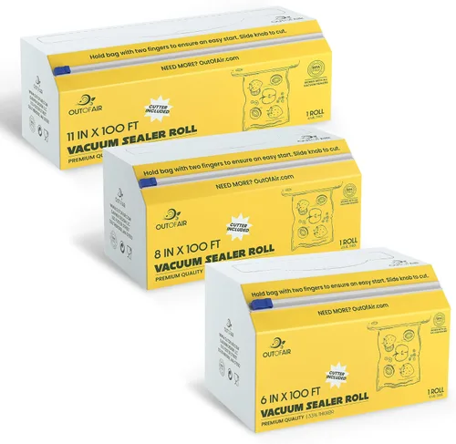 Cortador incluido: no más complicaciones con tijeras en esos rollos de 50 pies. Los rollos de 100 pies de OutOfAir vienen en una caja resistente con un cortador para que sea simple y conveniente cortar la bolsa de tamaño perfecto sin tener que alcanzar las tijeras. Funciona con todas las máquinas selladoras al vacío: las bolsas selladoras al vacío OutOfAir funcionan en todas las selladoras al vacío normales. Funciona con FoodSaver, funciona con VacMaster, funciona con Weston, funciona con Cabelas, funciona con Rival, funciona con Seal-a-Meal, funciona con Ziploc y más. 300 PIES DE BOLSAS DE VACÍO: 300 pies totales de bolsas de sellado al vacío. 100 pies de cada tamaño: 6", 8" y 11". INCREÍBLEMENTE FUERTE: Compáranos con otros. Utilizamos plástico resistente de 4 mil de grosor sin BPA. Nuestras bolsas son un 33% más gruesas que la mayoría de las bolsas vendidas. Eso significa que no tiene que preocuparse por objetos afilados que perforen sus bolsas. Garantía de devolución de dinero de 60 días: si las bolsas selladoras al vacío OutOfAir no cumplen con tus expectativas, lo haremos bien.