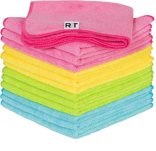 Microfibra RBT - Los paños de limpieza RBT vienen en un paquete de 12 y cuentan con cuatro colores: azul, rosa, amarillo y verde. Nuestra tela está compuesta de una mezcla de 80% poliéster/20% poliamida, y mide aproximadamente 12.6 x 12.6 pulgadas. Están diseñados para el uso práctico y diario por la persona promedio. Son multiusos, sin rayas y lo suficientemente convenientes como para caber en tu bolsillo trasero, bolso o departamento de guantes, pero lo suficientemente grandes como para cuidar superficies grandes. Uso: nuestros paños de limpieza de microfibra sin pelusas, sin rayas son una excelente herramienta de limpieza. Son ideales para, pero no limitado a cualquiera de los siguientes usos: electrodomésticos de acero inoxidable, todas las superficies de cocina y baño, encimeras, ventanas y tazas de vidrio, electrónica, armarios, sillas, pisos, paredes, gafas, juguetes para niños, automoción y mucho más Esquinas redondeadas y poliamida adicional: nuestros paños de limpieza de microfibra cuentan con esquinas redondeadas para evitar que se desenreden después del lavado a máquina. En comparación con los competidores, nuestros paños cuentan con el doble de poliamida, lo que te da el doble de resistencia, durabilidad, suavidad y absorción. Nuestro 300 GSM es un 10% más pesado que las marcas de la competencia, lo que hace que sea un tejido más grueso que es más absorbente y se seca más rápidamente. Reutilizables y de larga duración: estas toallas ultrasuaves se pueden lavar y reutilizar cientos de veces sin perder su calidad, suavidad o absorción. Esto los convierte en una excelente opción de eficiencia y durabilidad. Instrucciones de cuidado: estas toallas se pueden utilizar húmedas, secas o con un producto de limpieza de tu elección. Para obtener los mejores resultados cuando se utiliza con productos de limpieza, humedece completamente los paños de microfibra y añade una pequeña cantidad de producto de limpieza suave. Lavar a mano o a máquina con agua fría, en un ciclo suave y secar a baja temperatura o sin calor. No utilice suavizantes de telas o hojas de secadora, ya que puede afectar la absorción.
