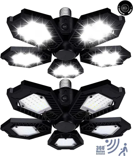 ️Luz de garaje con sensor de movimiento sensible: luces de garaje integradas en sensor avanzado de radar de microondas, la luz se encenderá automáticamente cuando las personas se muevan dentro del rango de 19.6 a 32.8 pies alrededor del garaje, es más amplia que la detección de movimiento normal, el ángulo de detección es de 360° y muy sensible, también puede detectar cualquier movimiento incluso en la pared. En comparación con la luz LED normal de garaje, diseñamos un botón individual para encender o apagar el modo de sensor de movimiento, es más conveniente y ahorra electricidad. ️Iluminación de 360 luces LED de garaje con chips LED muy brillantes: los 5 paneles de luz de las luces LED de techo de garaje se pueden ajustar 90° para ampliar el rango de iluminación, puede iluminar al menos un área de 270° sin ángulos muertos. Los potentes módulos LED con una salida de 15000lm mantendrán su habitación súper brillante y ahorrarán un 80% de factura eléctrica. Esta luz de garaje de 150 vatios con sensor de movimiento es igual a dos bombillas incandescentes de 300 vatios. ️¿Por qué elegir la luz LED de garaje Paoicole -- Utilizamos cuentas LED de 1 W en lugar de cuentas LED de 0.5 W utilizadas por la mayoría de los proveedores, es ultra más brillante que otras luces de garaje, y cada panel de luz tiene como máximo 27 cuentas LED, por lo que el calor generado durante el trabajo es bajo, y la disipación de calor es rápida, la vida útil de las cuentas de la lámpara es más larga. Muchas fábricas todavía dependen del número de perlas para aumentar la potencia y los lúmenes. La luz se romperá fácilmente. ️Duradero y ampliamente utilizado: la luz LED de techo de garaje está hecha con plástico de alta calidad disipado por calor, resistente a altas temperaturas, estable y duradero con el máximo rendimiento. La luz LED del garaje del sensor de movimiento es ampliamente utilizada en el garaje, sótano, almacén, taller, granero, ático, tiendas de automóviles, salas de exposición, banco de trabajo, estacionamientos, pasillos, cobertizos, lofts, gimnasios, supermercados, escuelas, hospitales, hoteles, lavanderías, bodegas, estudios y cuartos de servicio. ️Fácil de instalar: la luz automática de garaje es adecuada para la base E26/E27, fácil de instalar, no requiere herramientas, sin cableado y no se necesitan electricistas profesionales, simplemente atorníllala en un receptáculo de lámpara normal. ¡Cómpralo con confianza! Si tienes alguna pregunta y problema con el producto, envíanos un correo electrónico a través de Amazon, nuestro equipo de servicio está en línea las 24 horas.