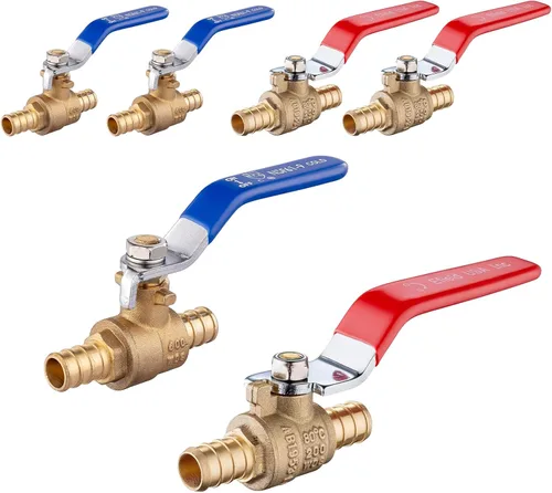Directamente de uno de los mayores fabricantes de sistemas Pex 6 PIEZAS Válvula de bola de cierre de puerto completo de 1/2 pulgada Pex de latón, caliente y fría (mango rojo y azul), sin plomo, segura para agua potable Compatible con todos los tipos y marcas de tubos PEX en tamaño de 1/2" Compatible con sistemas de abrazaderas de acero inoxidable y sistemas de anillos de crimpado de cobre Certificado con ASTM F1807 NSF/ANSI 61