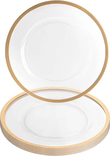 Party Bargains - Bajoplatos de 13 pulgadas (8 unidades) transparentes, borde dorado Bajoplatos desechables de plástico resistente. Bajoplatos