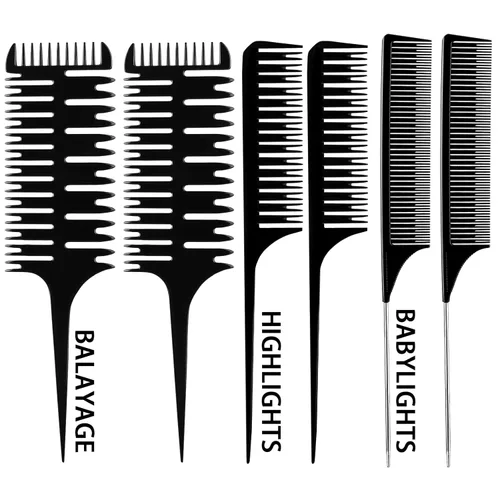 Contenido adecuado: este paquete viene con 6 peines de pelo en diferentes estilos, lo suficientemente adecuados para que puedas diseñar tus peinados diarios, también puedes compartirlos con tus familiares y amigos Material de calidad: estos peines de pelo están hechos de materiales plásticos de calidad, fuertes y ligeros, no se decoloran ni se rompen fácilmente, no dañan el cuero cabelludo o el cabello, y pueden aportar una experiencia de uso suave Diseño de dientes de peine: el extremo frontal de los dientes del peine se divide en 2 partes más delgadas, que pueden manejar el cabello con más delicadeza y distribuir el color de manera más uniforme cada vez que lo uses; otros 2 lados de tejido diferentes que proporcionan una opción más ancha o más estrecha y 1 peine regular en la parte superior Cómodo de operar: nuestros peines son suaves de peinar y fáciles de operar, te hacen lucir más encantadora y hermosa. A medida que se peina a través de una sección del cabello, parte del cabello estará en los dientes superiores y parte estará en los dientes inferiores, fácil de dividir para colorear Peines multifuncionales: estos peines para el cabello son adecuados para resaltar el cabello, seccionar, tejer, teñir, colorear, peinar y más, ayudan a peinar y alisar tu cabello, se pueden aplicar en salones de belleza, también son adecuados para los entusiastas de los tintes para el cabello para usar en casa