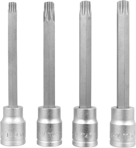Largo alcance: el juego de brocas de freno largo Performance Tool W86020 de 4 piezas de 3/8 pulgadas cuenta con un 4 pulgadas. longitud total, proporcionando un alcance extendido para acceder a los pernos de pinza de freno de difícil acceso. Variedad de tamaños: este juego de brocas de freno incluye cuatro tamaños diferentes - T40, T45, T47 y T50 - por lo que es versátil y adecuado para su uso en varias marcas y modelos de automóviles. Acero tratado térmicamente: fabricadas con acero de aleación tratado térmicamente de alta calidad, estas puntas de estrella de pinza de freno son duraderas y construidas para durar, asegurando un uso y fiabilidad a largo plazo. FÁCIL DE USAR: El diseño de accionamiento de 3/8 pulgadas de este juego de brocas de freno hace que sea fácil de usar con una gama de trinquetes y llaves, lo que le permite quitar e instalar rápida y fácilmente las pinzas de freno. Amplia aplicación: este juego de brocas de freno es compatible con muchas aplicaciones en marcas de automóviles populares como Buick, Cadillac, Chevrolet, Dodge, Ford, GMC, International, Jeep, Lincoln, Mercury, Oldsmobile, y Pontiac.