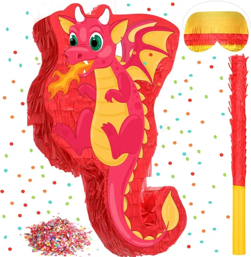 Piñata de dragón grande de 16 pulgadas con palo vendados y confeti, paquete de piñata para niños, piñata de dinosaurio que respira fuego, para niños y niñas, fiesta de cumpleaños de dragón, decoración Característica: Material de calidad: Esta piñata de dragón está hecha de papel corrugado grueso, y las delicadas calcomanías la hacen más vívida. Los materiales confiables garantizan su durabilidad, te permiten jugar más tiempo. Todos tendrán la oportunidad de golpearlo. Diviértete tiempo: Puedes llenar la piñata decorativa de dragón con dulces, confeti, golosinas, juguetes pequeños o regalos, hacer que tus invitados usen anteojeras, romper la piñata con un palo de piñata hasta que se libere el relleno, luego piensa en lo que son, el ganador recibirá un premio, muy divertido y podrá animar tu ambiente de fiesta. Información básica: Material: papel corrugado Color: como se muestra Tamaño: 16 x 10 x 3 pulgadas El paquete incluye: 1 piñata de dinosaurio. 1 palito de piñata 1 venda para los ojos. 1 paquete de confeti Notas: Medición manual, puede haber ligeras diferencias de tamaño. Debido a la pantalla, el color del artículo puede diferir ligeramente del de la imagen.