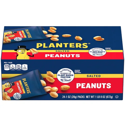 Planters Los cacahuetes salados siguen la receta original de Planters que todos conocen y aman. Con un sabor legendario y un crujido satisfactorio, estos cacahuetes están hechos con solo tres ingredientes simples: cacahuetes, aceite de maní y sal marina. Cada maní está finamente sazonado con sal marina para mejorar el sabor natural de la nuez tostada. Estos cacahuetes perfectamente tostados tienen 0.25 oz de proteína y son una buena fuente de vitamina E. Libre de colesterol y grasas trans, los cacahuetes de Planter's tienen 0.45 onzas de grasa por porción son el aperitivo salado perfecto para llevar. Disfrute del sabor tradicional y el crujido de un puñado de nueces tostadas. Estas cajas de maní de 24 unidades son un gran aperitivo para aquellos que mantienen Kosher y cada paquete de 1 onza es ideal para bocadillos sobre la marcha.