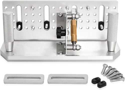Material: la plantilla es un cuerpo no corrosivo hecho de aleación de aluminio T6 6061 y está fabricado con máquinas CNC sensibles. La bisagra está incrustada en el cuerpo principal del Jig y nunca vibra. Todas las piezas y superficies de contacto están anodizadas para evitar la corrosión y el óxido. La superficie está rectificada y ajustada estrechamente para proporcionar la máxima perpendicularidad que afecta a la forma de la cuchilla final. La placa inferior está equipada con una lámina de ABS de 0.150 pulgadas, como un patín, se desliza suavemente sobre el soporte de trabajo. Ángulo ajustable: la placa transportadora está hecha de acero inoxidable y procesada por procesamiento láser. El dial está grabado con una escala con un rango ajustable de -5°~25°. La perilla de bloqueo y la combinación de tensor en el dial garantizan cero movimiento. El puntero se puede ajustar con una llave para lograr una precisión absoluta. El tensor de rosca súper fina se puede ajustar con absoluta precisión. ∮FÁCIL DE SUJETAR∮ - Tiene 52 agujeros de montaje roscados (1/4-20 UNC) y 8 pernos adicionales para conectar tus cuchillos, 2 placas de sujeción rectangulares galvanizadas y pernos que se pueden utilizar para fijar cuchillos a cualquier altura para muchos modelos de cuchillos diferentes. Sujeciendo la hoja de forma segura a la plantilla de bisel con 2 abrazaderas en lugar de los pernos, obtendrá un agarre más firme y aceptará cuchillas de hasta 11 mm (0.4") de grosor. Uso cómodo: el mango de aluminio proporciona una sensación sólida sin peso adicional. El perfil de aluminio más común en uso hoy en día es la aleación T6-6061, que tiene una resistencia a la tracción muy alta. El mango de aleación de aluminio está grabado con patrones de aluminio, lo que puede aliviar el esfuerzo físico de las manos del maestro (tensión muscular, cargas de vibración en tendones y articulaciones). ∮FÁCIL DE AFILAR∮ - La plantilla de afilado es adecuada para la mayoría de amoladoras eléctricas o manuales con o sin soporte de herramientas. Se puede instalar rápida y fácilmente directamente en la mesa de trabajo frente a la amoladora. El accesorio se puede ajustar hacia adelante y hacia atrás para obtener el ángulo recto.