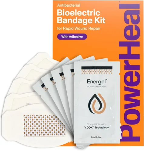 Hágase cargo de su curación: Durante mucho tiempo, el cuidado de las heridas ha sido esperar a que la lesión sane, ¡pero ya no! Al generar electricidad para potenciar la energía eléctrica natural de tu piel, las vendas PowerHeal ponen el poder de una curación rápida en tus manos, ayudando a que tu herida sane de forma rápida, segura y natural Ayuda a que tu herida sane hasta 2-3 veces más rápido: la tecnología de PowerHeal crea un ambiente húmedo esencial para la herida, proporciona una protección crítica contra infecciones y ofrece apoyo eléctrico adicional para acelerar el proceso de curación, y una curación más rápida puede llevar a una reducción del dolor y las cicatrices Diseñado para una amplia variedad de heridas: se utiliza para una variedad de tamaños y tipos de heridas, desde cortes grandes y pequeños, rasguños, abrasiones, irritaciones, ampollas y quemaduras menores, hasta heridas difíciles de curar Solución de vendaje de 3 capas todo en uno: el vendaje está construido con una capa bioeléctrica que combate infecciones, una capa intermedia absorbente y una capa exterior adhesiva suave; el kit también incluye Energel Wound Hydrogel, el gel que activa las baterías de microcélulas integradas del vendaje y ayuda a mantener un ambiente húmedo de la herida La única venda bioeléctrica del mundo: PowerHeal tiene la misión de brindarte una curación rápida y segura en casa con acceso a tecnología de cuidado de heridas de grado médico; hemos ayudado a curar más de 1 millón de heridas, estamos respaldados por datos clínicos y científicos, y somos de confianza para médicos y enfermeras especialistas en el cuidado de heridas