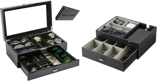 Este paquete contiene una caja de visualización de reloj con acabado de piano y una bandeja de valet de doble capa Caja de reloj con marco de madera de lujo con acabado de piano de poliéster y forro interior suave; colección de relojes con orgullo; Dimensiones: 13.78 x 8.27 x 5.12 pulgadas 6 ranuras para relojes y 3 posiciones para gafas en la capa superior; cada compartimento de reloj (3.54 x 1.97 x 1.97 pulgadas) tiene un cojín extraíble que sostiene un reloj pequeño o grande (hasta 1.969 in) perfectamente en su lugar Coloca o recoge fácilmente llaves, monedas y otras probabilidades y extremos, permite espacio para el teléfono, cargador, relojes, collares, pulseras, uso diario de joyas y otros artículos diarios para guardarlos perfectamente en un solo lugar Organizador de mesita de noche clásico y elegante, que debe ser una parte necesaria de cada mueble del hogar, se puede utilizar en tocador, lado de la cama, armario, mesita de noche, entrada y mesa