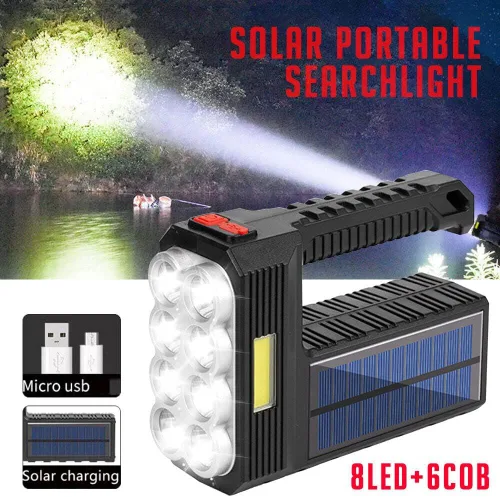 Especificación: Nombre: reflector portátil solar Color: negro Potencia: 20W bombilla: 8LED+6COB Método de carga: carga USB + batería de carga solar: batería de litio incorporada Capacidad de la batería: 1500mAh Tiempo de carga: 3-5h Tiempo de vida: 6-15h Modo de iluminación: 4 niveles ajustables (luz principal: luz fuerte/luz baja/flash de ráfaga; luz lateral: luz fuerte) Rango máximo: 20 0-300 Metros Clasificación impermeable: IPX4