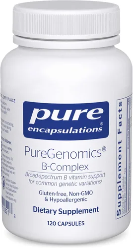 Complejo Vit B para metilación: PureGenomics B-Complex utiliza formas activadas de vitaminas B para abordar los requisitos de nutrientes de variaciones genéticas comunes* Cápsula de complejo de vitamina B activada: proporciona vitaminas B activadas, incluyendo vitamina B6, riboflavina/vitamina B2, benfotiamina y 800 mcg de L-5-MTHF Mezcla de Vitamina B12: La Vitamina B12, ofrecida como una combinación de hidroxocobalamina y adenosilcobalamina, apoya el metabolismo de carbohidratos y la mielina neuronal* Suplemento para la salud cerebral: las vitaminas del complejo B para mujeres y hombres apoyan la salud celular, la producción de hormonas y neurotransmisores, y el metabolismo energético* Diferencia pura: lo que dejamos fuera también importa; los productos Pure Encapsulations están libres de alérgenos comunes, ingredientes artificiales o innecesarios y OGM