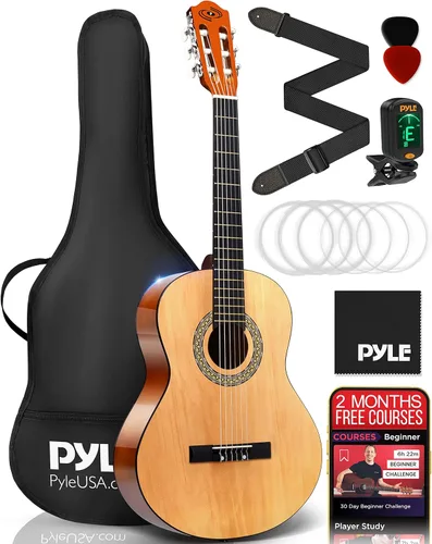 • Juego de guitarra de 36 pulgadas para principiante: Pyle te trae un juego completo de guitarra acústica todo en uno, todo lo que necesitas para empezar a tocar. La guitarra viene con una funda de funda, afinador de pipa de tono, cuerdas de repuesto, púas de pearloid, paño de limpieza, y una tarjeta de regalo. Tamaño de escala juvenil: Una guitarra de 6 cuerdas de escala junior perfecta para usar en lecciones, recitales, ensayos de banda, actuaciones en el escenario o cuando se practica en casa. Tiene un estilo tradicional de cuerpo clásico ideal para principiantes y niños que aprenden a tocar la guitarra. Hecha a mano: La guitarra clásica cuenta con una fabricación hecha a mano con cuerpo de madera de tilo, clavijero de abedul, diapasón de madera de arce teñida, cuerpo y parte trasera pulidos de alto brillo con encuadernación protectora, acabado laminado de tilo rosetón, clavijas cromadas 3 en línea. Lista para principiantes: Este tradicional instrumento acústico de cuerdas es excelente tanto para principiantes como para niños que buscan empezar a tocar la guitarra. Te entrega todo lo que necesitas para empezar a tocar directamente desde la caja. Especificaciones: Longitud total: 36 pulgadas. Longitud de la escala: 22.8 pulgadas. Longitud total del cuerpo: 17.3 pulgadas