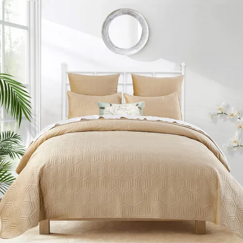 Querencia Juego de edredón de terciopelo de lujo tamaño Queen, edredón beige tostado, edredón geométrico acolchado, colcha bordada, ropa de cama