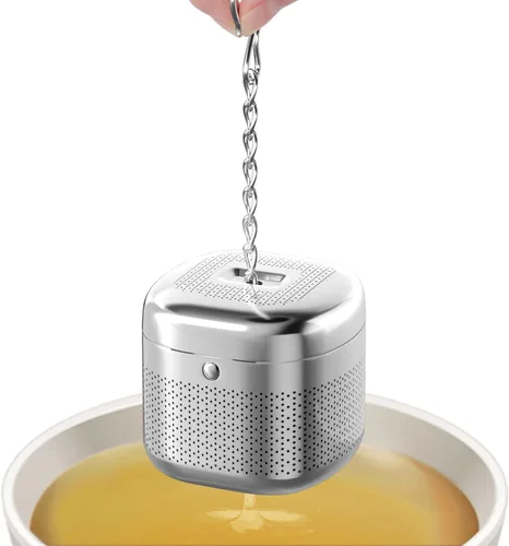 Agujeros de malla extremadamente finos: El infusor de té de hojas sueltas cuenta con agujeros de malla extremadamente finos, lo que permite una infusión completa de hojas de té, partículas o molido, resultando en una máxima extracción de sabor y una mínima fuga de sedimentos. Materiales de alta calidad: Hecho de acero inoxidable 304 de grado alimenticio, el colador de té para té suelto es más fácil de limpiar. Además, el infusor de bolas de té garantiza que no tenga sabor metálico en tu té o café y nunca se oxida durante años de uso. Alternativa ecológica que ahorra dinero a las bolsas de té desechables y los filtros de papel. Conveniente: el diseño actualizado de la tapa a presión es más fácil de abrir/cerrar y mucho más seguro que la tapa giratoria tradicional, por lo que las bolsas de té reutilizables para té de hojas sueltas pueden mantener la tapa segura durante la preparación. Además, puedes retraer la cadena hacia el interior del infusor de bola de té después de preparar el té y colocarlo en nuestra bandeja de goteo. Amplia aplicación: 3.99 cm L x 3.99 cm A x 3.99 cm H Infusor de té para té suelto que puede contener 3 cucharaditas de hojas de té y se adapta perfectamente a diferentes tamaños de tazas, vasos, teteras, jarras, botellas y jarrones. La cadena extendida de 5 pulgadas con mango en S hace que el soporte para hojas de té se enganche de forma segura en cualquier borde del recipiente. Paquete: Viene con 1 infusor de té de hojas sueltas y 1 platillo. El platillo es útil para evitar hacer un desastre cuando sacas los infusores de té de hojas sueltas después de preparar el té.