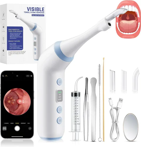 Cámara HD de 360°: nuestro kit de eliminación de piedras de amígdalas está equipado con una cámara HD de 30 W píxeles de gran angular de 360°, aumento de 3x y luz LED, lo que le permite ver claramente cada rincón de su boca y experimentar una eliminación rápida y fácil de piedras amígdalas. La tecnología de adsorción al vacío puede lograr un 99.9% de eliminación de piedras eficiente y cómoda en casa. 3 modos de limpieza: la aspiradora de piedra amígdala ofrece tres modos de limpieza diferentes: suave, limpio y potente. Ya sea que tenga amígdalas sensibles o necesite una limpieza más completa, estos modos se pueden ajustar fácilmente para satisfacer sus necesidades específicas. Simplemente pulsa un botón para cambiar entre modos y disfrutar de una experiencia de limpieza personalizada. Fácil de usar: diseño ergonómico, cómodo de sostener. El kit electrónico de eliminación de piedras amígdalas proporciona 2 sondas de silicona, 1 sonda ABS. Los accesorios totalmente equipados son adecuados para diferentes grados de limpieza bucal para satisfacer diferentes preferencias. Carga tipo C, batería de larga duración Batería de litio integrada de 900 mAh, se puede utilizar aproximadamente 45 veces con una sola carga, soporta 3 meses de uso intermitente. Soporta dispositivos Android y Apple: Escanea el código QR para descargar la aplicación. Mantenga presionado el botón de encendido para encender el dispositivo, y conecte la cámara a través del dispositivo WIFI para usarla. Las fotos y videos tomados por el dispositivo se almacenarán en el álbum de la aplicación. Si desea guardar en su álbum de teléfono móvil, permita que la aplicación acceda a su álbum. Fácil de usar y mantener: nuestro kit de eliminación de piedras amígdalas simplifica el proceso de operación y es más seguro que usar hisopos de algodón o dedos. Simplemente use la jeringa proporcionada para enjuagar las amígdalas con agua tibia, luego seleccione su modo favorito para comenzar a usar. Para obtener instrucciones paso a paso, mira nuestro video de instrucciones y manual de usuario (idioma español no garantizado). La cuchara y la lente accesorios se pueden limpiar con agua o limpiar con algodón alcohólico después de su uso. (No ponga toda la máquina en agua!)