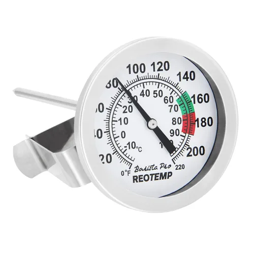 El Reotemp K83C1 Barista Pro es un termómetro de cocina diseñado para ayudar a espumar la leche y al vapor para hacer lattes, capuchino y otras bebidas lácteas al vapor. Nuestra construcción de alta calidad garantiza una unidad confiable y fácil de leer para uso doméstico y comercial. La unidad está sellada, cuenta con una lente de vidrio y se puede lavar a mano para su limpieza. Los rangos resaltados guían al usuario en mantener la leche a una temperatura óptima de espumación. El clip mantiene la unidad segura al lado de tu jarra. Utilizamos solo acero inoxidable 304 de alta calidad en la construcción del vástago y el bisel del termómetro. El K831 es compatible con Reotemp con una garantía limitada de 1 año.