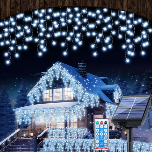 Retisee Luz solar de Navidad de carámbano blanco frío de 65 pies para decoración al aire libre, 600 LED impermeable, cortina de Navidad, tira de