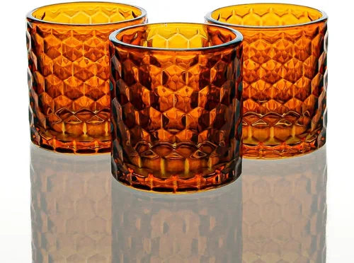 Richland Soporte votivo y portavelas de cristal de panal grueso ámbar. Estos ricos soportes de néctar de panal gruesos son para morirse. El acabado brillante de este soporte de vidrio de calidad combinado con el diseño texturizado de panal crea la combinación perfecta para sorprender a tus invitados. Una vez que se enciende una vela en el interior, los ángulos del vidrio crearán un brillo que es encantador. Una excelente opción para una boda de otoño, velada de otoño, cena de Acción de Gracias y mucho más. Crea un impresionante entorno de mesa para cualquier celebración. Dimensiones: 3" (Alto) x 2.8" (Ancho). La apertura es de aproximadamente 2.25 pulgadas. Combina estos soportes con nuestras velas votivas o candelitas Richland para completar tu look (las velas se venden por separado). Nota: No se garantiza que sea apto para lavavajillas o detergente.