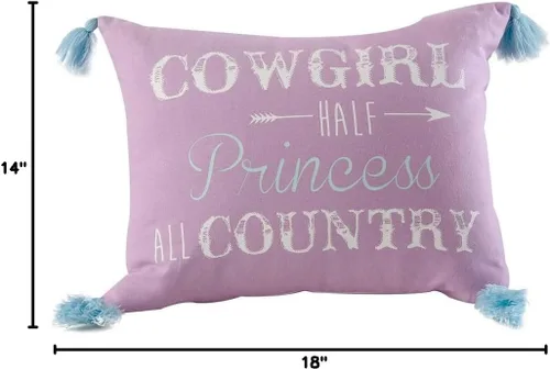 ALMOHADA DE HALF COWGIRL HALF PRINCESS ALL COUNTRY ACCENT PILLOW: Adornada con borlas azules en cada esquina, esta almohada de acento impresa combina perfectamente con nuestros juegos de cama de princesa vaquera para añadir el toque justo de estilo occidental. Lujo suave y cómodo: hecho de material que nunca se sentirá pesado, rígido o incómodo, la almohada Half Cowgirl Half Princess tiene una sensación ultra suave que simplemente te encantará. Nuestra almohada estampada tiene el tamaño perfecto (14 x 18 n.) para mejorar la decoración de tu dormitorio con estilo occidental Fácil cuidado: hecha de tela de calidad, esta almohada decorativa se limpia fácilmente con un paño húmedo. Se incluye un relleno de almohada no extraíble con la funda. Coordina la decoración de tu habitación: crea un llamativo espacio de dormitorio de vaquera occidental con nuestra almohada de acento Half Cowgirl Half Princess. La divertida almohada morada tiene un guión impreso en blanco que dice "Half Cowgirl Half Princess All Country". Añade esta almohada para combinar con una variedad de diferentes estilos y decoración de dormitorio. Puedes refrescar aún más tu habitación con el juego de cama a juego en una bolsa de la colección de ropa de cama exclusiva Cowgirl Princess de Rod's True Western.
