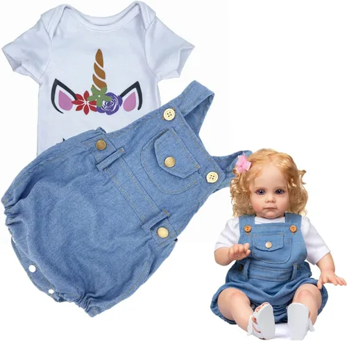 Ropa de muñeca recién nacida hecha a mano, súper encantadora, accesorios de ropa. Tamaño: ropa de muñeca de 24 pulgadas, se adapta a tus muñecas recién nacidas de 22 a 24 pulgadas en la vida diaria. Diseño: Una combinación de mono vaquero y camiseta blanca. Estilo único y de moda, no pasa de moda. Tela 100% algodón, suave y agradable al tacto. El juego de ropa para muñecas incluye: 1 pantalón, 1 camiseta. (No incluye muñeca) Dulce regalo: este accesorio de ropa de muñeca Reborn se puede utilizar como regalo de cumpleaños, Acción de Gracias, Navidad.