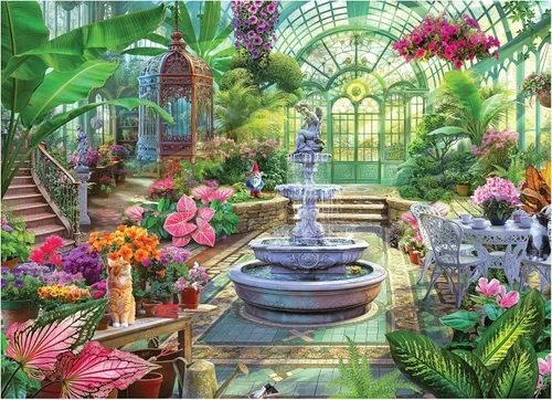OBRA DE ARTE DE CONSERVATORIO VIBRANTE: Entra en un exuberante invernadero bañado por el sol que rebosa de flores vívidas, vegetación tropical y arquitectura ornamentada. Esta escena ricamente ilustrada captura la serenidad y la maravilla de un refugio botánico DETALLES OCULTOS ENCANTADORES: Mire de cerca y descubrirá toques encantadores como un curioso gato naranja, un centro de mesa de fuente de piedra, una rana, llaves y un gnomo escondido entre las flores. Este rompecabezas mide 19.25" x 26.625" cuando está completado—perfecto para enmarcar o exhibir Calidad prémium: fabricado con cartón reciclado e impreso con tintas a base de vegetales; asegurando durabilidad, colores vivos, ajuste preciso y un acabado de calidad PIEZAS TOTALMENTE ENTRELAZADAS: Disfruta del satisfactorio "CIERRE" cuando cada pieza encaja perfectamente; diseñadas para un proceso de ensamblaje sin problemas. Cada rompecabezas de RoseArt viene con un póster adicional a todo color para una fácil referencia mientras construyes tu nuevo rompecabezas HECHO CON ORGULLO EN LOS ESTADOS UNIDOS – Cada rompecabezas RoseArt se fabrica en los Estados Unidos combinando artesanía de calidad con una producción responsable en la que puedes confiar