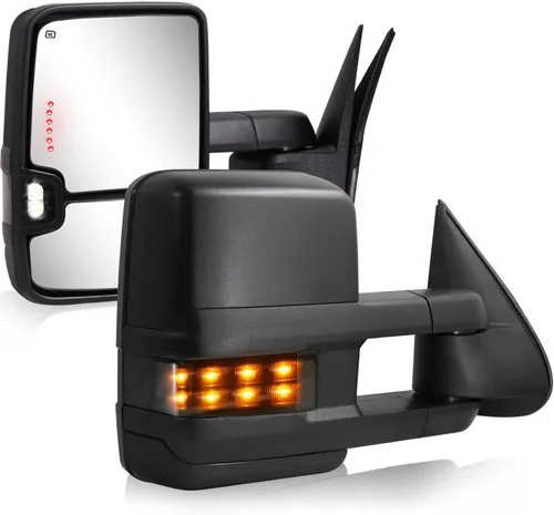 Compatible con: apto para Chevy Silverado 1500, 2500 1999-2002; Silverado 1500HD 2000-2002; Silverado 2500HD y 3500 2001-2002; GMC Sierra 1500 2500 1999-2002; 2001-2002. 2 GMC Sierra 1 500HD, 2500HD y 3500; Suburban 1500 2500 2000-2002; Yukon 2000-2002 Funciones: Vidrio de potencia ajustable; vidrio plano y vidrio convexo; Luz de señal de giro led en el espejo y la parte posterior; luz de respaldo; descongelación automática de la calefacción; telescópico manual y plegable Excelente calidad: nuestros espejos de remolque Chevy están construidos según estrictos estándares de control de calidad, hechos con base de aluminio ultra fuerte, caja de plástico ABS texturizado negro ligero y duradero, que no se agita ni vibra al conducir Consejos: Si sus espejos de remolque originales no tienen algunas funciones, deberá volver a cablearlos. Recomendamos una instalación profesional Lo que obtienes: un par de espejos de remolque Chevy; arnés de cableado; guía de instalación