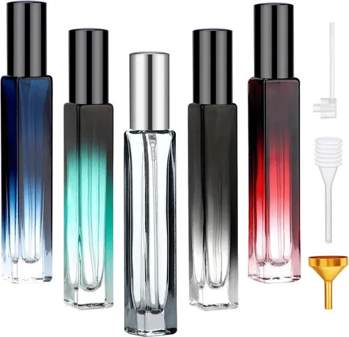 Portable para llevar: Juego de 5 botellas de perfume de vidrio, cada una de 10 ml. Ligero y portátil, es fácil y cómodo de almacenar y transportar. Ideal para colocar en tu bolso o bolsillo, puedes usarlo en cualquier momento y en cualquier lugar Atomizador de niebla fina: con la utilización de boquilla de alta precisión, estas botellas de perfume proporcionan un spray de niebla fina y uniforme, es ideal para dispensar perfume Diseño a prueba de fugas: Hecho de vidrio de alto impacto, el rociador es de ajuste hermético, la abertura es de rosca estructural, que es sólida, resistente al desgaste y duradera. No te preocupes por roturas o fugas Fácil de rellenar: viene con 1* embudo+1* gotero+1* bomba, puede dispensar fácilmente líquido en el mini atomizador de perfume Multiaplicación: Ideal para perfume, fragancias, colonia, spray facial, productos de higiene, varios líquidos a base de agua. Un accesorio cosmético ideal para la actividad diaria, especialmente para viajes y salidas